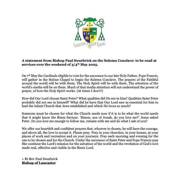 As read at Mass this weekend, the Bishops Pastoral Letter regarding the upcoming Papal Conclave this week.